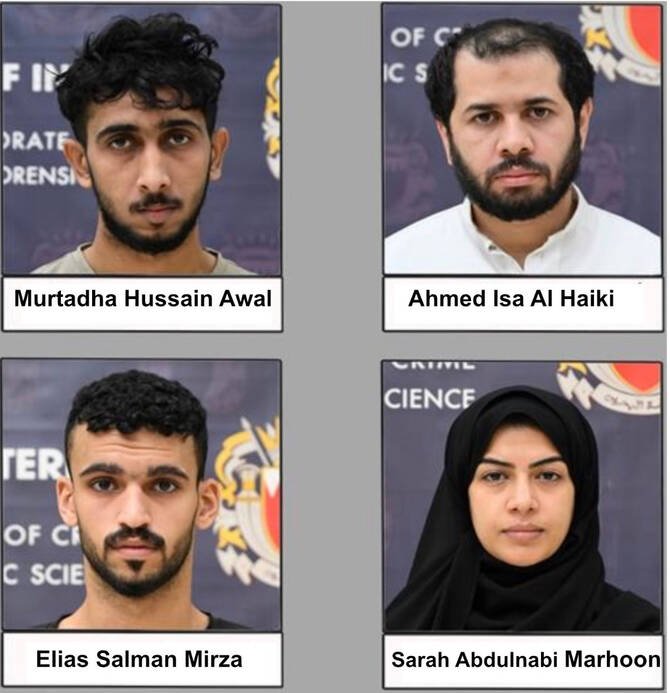 حددت المديرية العامة للتحقيقات الجنائية والأدلة الجنائية في البحرين هوية المحتجزين الأربعة وهم: مرتضى حسين عوال، 25 عاماً؛ أحمد عيسى الحيكي، 34 عاماً؛ سارة عبد النبي مرهون، 36 عاماً؛ وإلياس سلمان ميرزا، 22 عاماً. ولا يزال المشتبه به الخامس، علي محمد حسن الشيخ، 25 عاماً، طليقاً في الخارج.